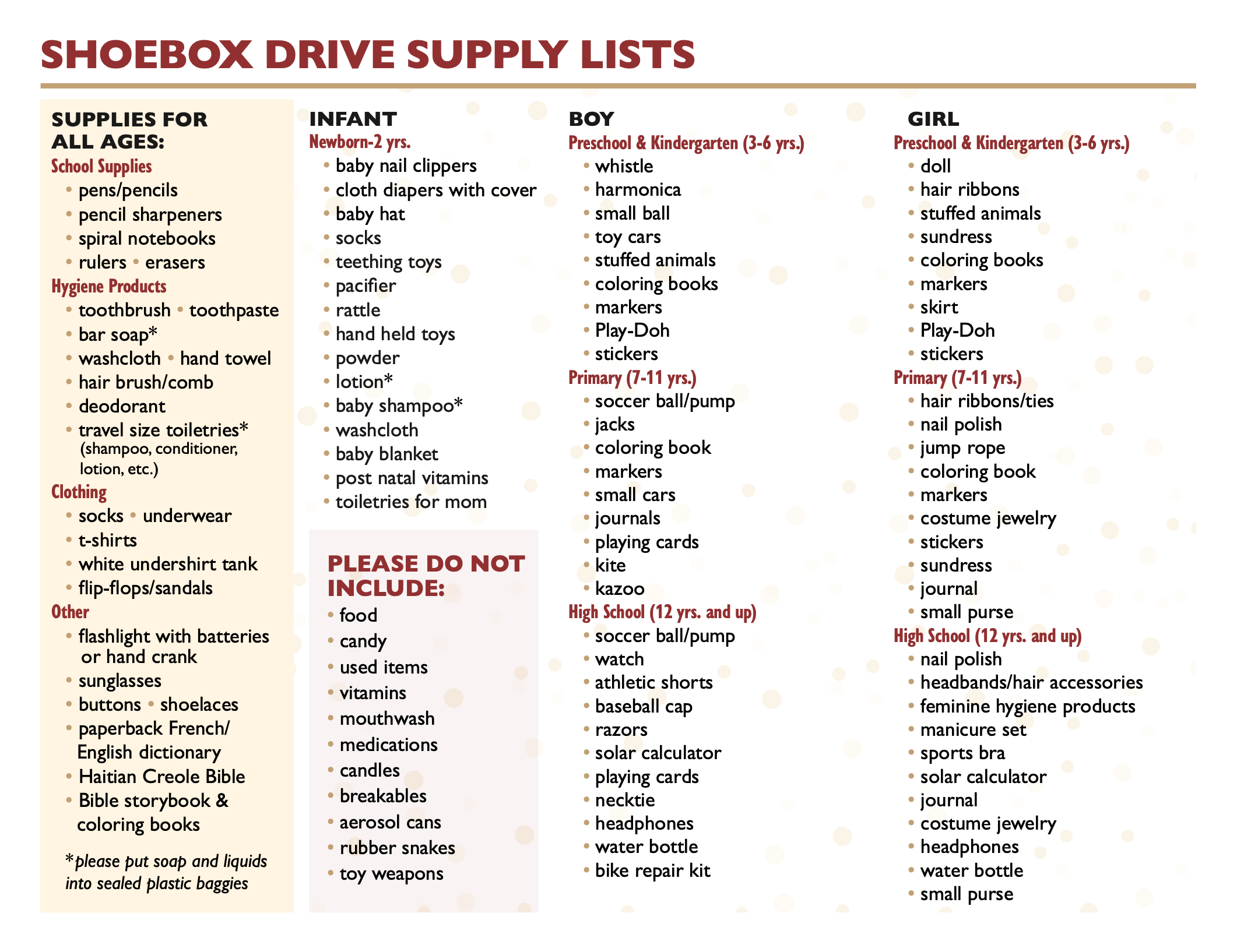 Starting October 19th, grab a shoebox and fill it with school supplies, hygiene items, clothing, small toys, and more to be sent to bless children in Haiti! Packing list ideas can be found below and on ShoeboxDrive.com